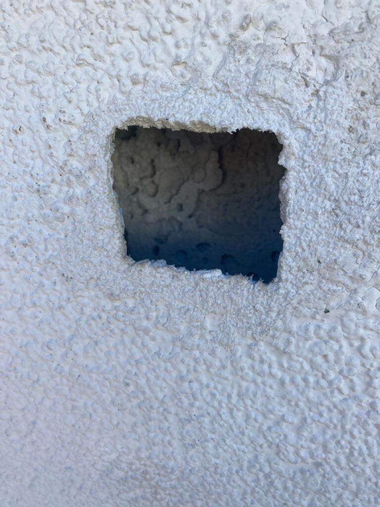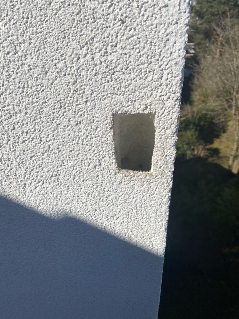 Auch wenn heute der Kalender den 01. April anzeigt – DIES IST KEIN APRILSCHERZ! Wir haben schon auf und in tausende Spechtlöcher geblickt, aber diese Ansicht war selbst für uns alte Spechthasen ein ganz neuer Anblick. Offenbar hat dieser Specht eine neue Bewusstseinsebene erreicht und geometrisch exakte quadratische und rechteckige Öffnungen angelegt. Ein Quantensprung! Vielleicht kann er dann in nicht allzu ferner Zukunft auch lesen und wir müssen dann nur noch Hinweisschilder an den Fassaden anbringen, wie z.B. „Löcher bohren verboten“ oder “ Nur ein Loch pro Ecke erlaubt“ oder „Klopfen nur werktags von 07 – 19 Uhr“.. Und schwuppdiwupp ist das Spechtproblem Vergangenheit. Licht am Ende des Tunnels für viele leidgeplagte Eigentümer! Wir Spechtfritzen müssen uns dann auch nicht mehr mit aufwändigen Spechtlochreparaturen und Spechtabwehr herumschlagen, wir montieren dann überall nur noch Schilder.. sowas vielleicht: